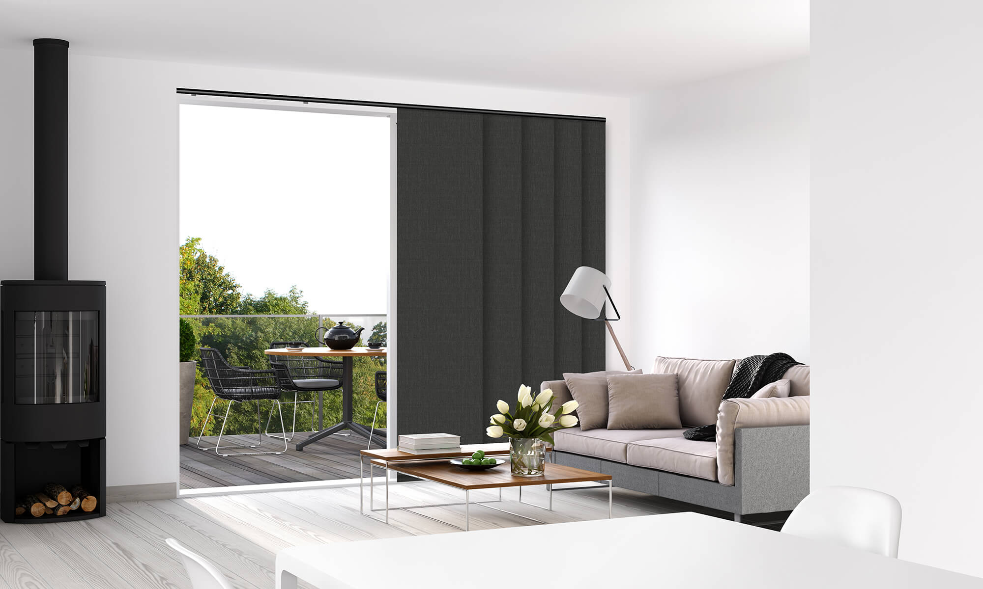Vertical Drapes are an ideal covering for sliding doors and windows. They can be configured to open from the centre, or stack to either side with a child safe wand. The control wand also allows tilt adjustment of the blades for the perfect control of light, airflow and privacy. With the option of 89mm or 127mm wide fabric blades, available in a broad range of Fabrics and light filtration options, our Vertical Drapes offer an excellent shade solution that will compliment your home or business.